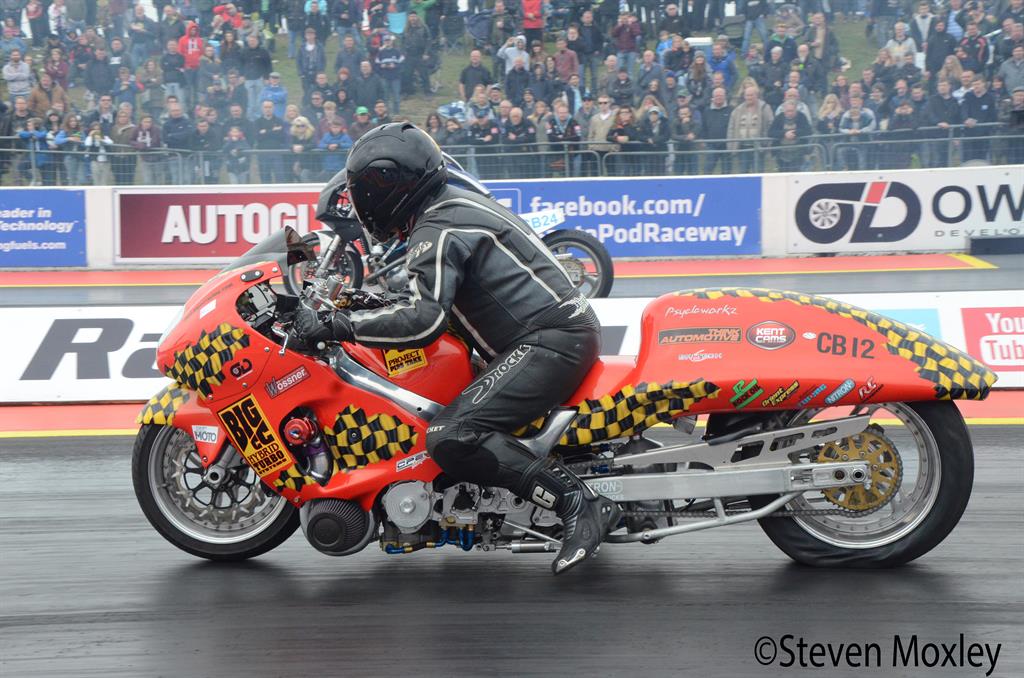 Dave Peters has made a superb start to the championships, winning both rounds of Funnybike.  Filippos Papafilippou will be trying to sort out his fuel set up after he lost in the final of the European FIM Championships here at Santa Pod.  He has run 6.54 at 206mph.  Bob Brooks will have a bigger fuel pump fitted for the event and will be hoping to run his first six-second pass, he was runner up to Peters here at Easter.  Second place Allan Davies will have his 1500cc motor back in the frame of the bike for this event.  Two other riders to look out for are Dave Buttery who has run 7.33 and Eric Richard from France who won last year at Shakespeare County and has run 7.38.  Team Warpspeed will be out with Stuart Crane and Dale Leeks.  Making a return to competition is Shaun Branch.