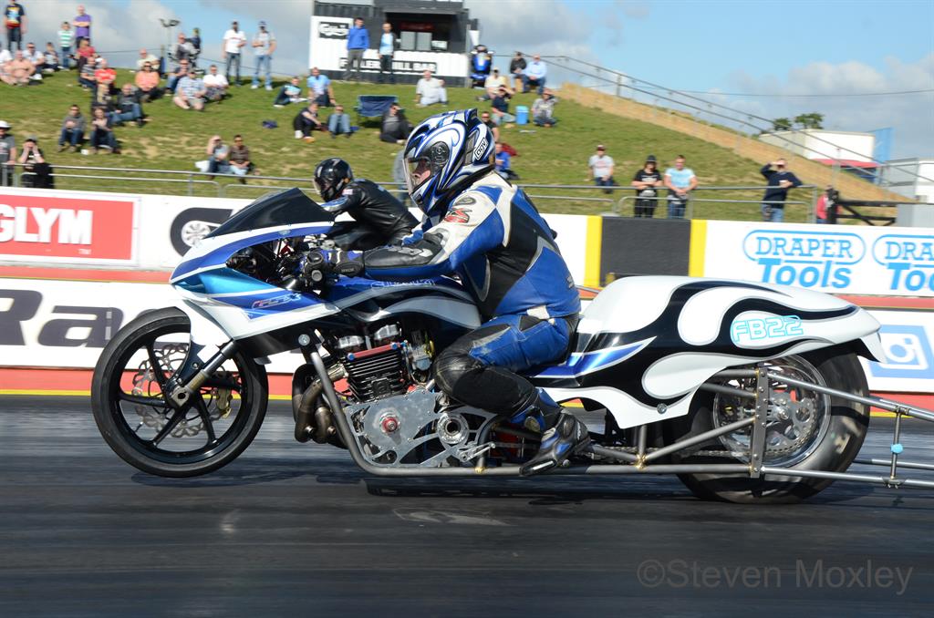 Lorcan Parnell tested on the Friday (day before the event) and ran 7.05 and 6.89 (first six-second pass) and qualified in number one spot 6.892 at 203.49mph and set an ACU Championship speed record of 200.50mph.. Filippos Papafilippou had a weekend he will never forget. He started racing he new Funny Bike but had transmission issues and hopped on his other bike and qualified 6.973 at a slow 161mph. Stuart Crane recorded his first six-second pass 6.996. There were also personal bests for Dave Peters 7.137 and Phil Crossley (new bike) 7.697. Championship contender Bob Brooks had his engine sump split and was out of the show.