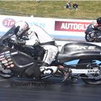 Davies fitted bigger jets for the eliminations, resulting with figures of 7.038-182.88 on his bye run to the final. Moore put a holeshot over Peters rt287 to397 but Peters stormed down the track to win 7.362-175.75 to Moore 7.641-170.45. Davies got out the gate first rt132 against Peters rt200 in the final only to reach the 1000 ft mark with smoke coming from the engine. Peters powered around with his best run of the weekend 7.319-188.07.
