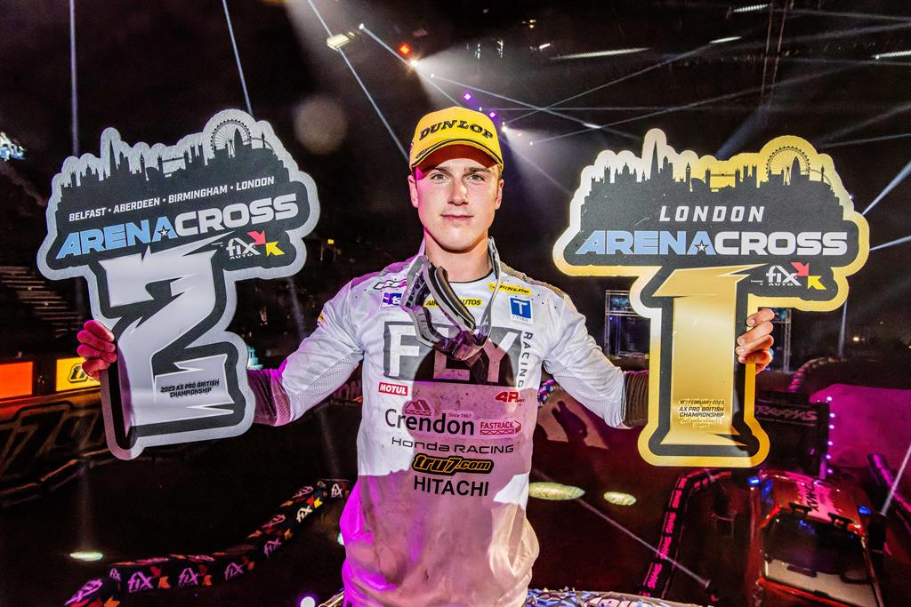 Tommy Searle of GTCi REVO Kawasaki won the 2023 Arenacross British Championship by a single point after finishing second to rival Conrad Mewse, Crendon Honda Fastrack Racing, in a nail-biting 14-lap finale at the OVO Arena Wembley, that went right to the wire.