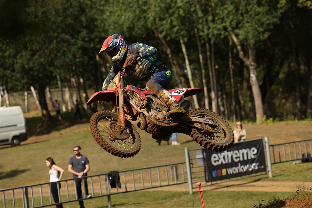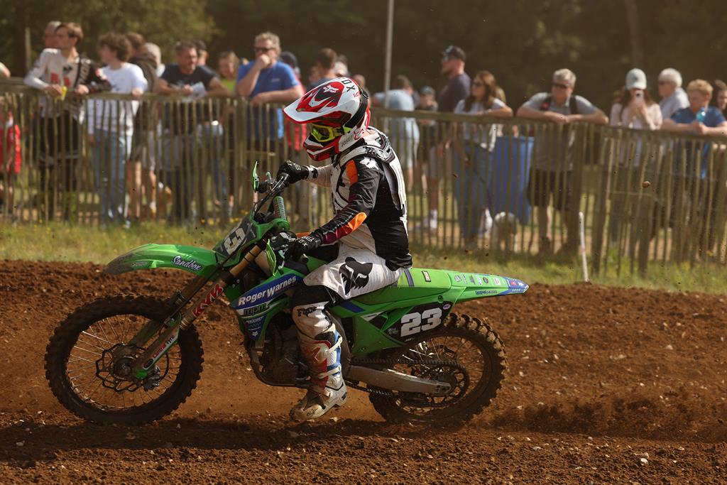 In Premier class race one, Tom Grimshaw (Apico Honda) powered his 450 to the front with Nunn and the returning Jake Nicholls (Crendon Tru7 Honda) close behind. Wildcard Chris Mills was also quick out of the gate and looked to chase down the local regulars on the first lap. Nicholls waited for the right moment to strike and flew past Grimshaw and into the lead to the delight of the crowd, while Mills made a move into third past Nunn who was having to defend from the current champion Luke Parker (MPM Kawasaki). Nicholls would then check out and go on to take the race win ahead of Grimshaw, Mills, Nunn and Parker, with Dylan Woodcock on his Honda in 6