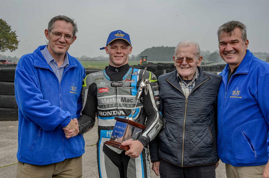 The Ben Godfrey Trophy race was next to the grid and the only winner of the Trophy, Matt Bell (Sheffield) had a 28point lead coming into this weekend, over Adam Walters (Derby). The opening lap gave Jordan Rushby (Hull) the lead across the line, Bell 1sec adrift, 2nd, with Sam Johnson (Minskip) 3rd, and Walters, 4th and other then Bell reducing the gap to 0.5sec, this was how they stayed throughout the race, allowing Bell to strengthen his grip on the Trophy, again. Bell was determined in the afternoon to secure his 3rd Ben Godfrey Trophy, circulating 2nd after the opening laps, behind Johnson, but taking the lead on Lap3 and stretching out a 1.3sec advantage over Johnson, with Walters, finishing 4th after dropping a place after a challenge from Mark Goodings (Doncaster). The victory giving Bell an unassailable 39point advantage going into Sunday’s races, Ben Godfrey Trophy number three!