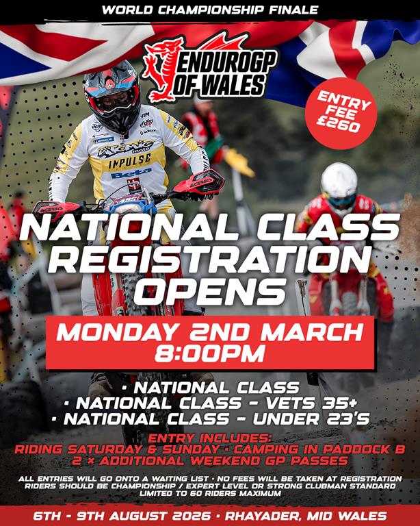Registration for the National Class at the Enduro GP of Wales will open on Monday 2nd March at 8pm.