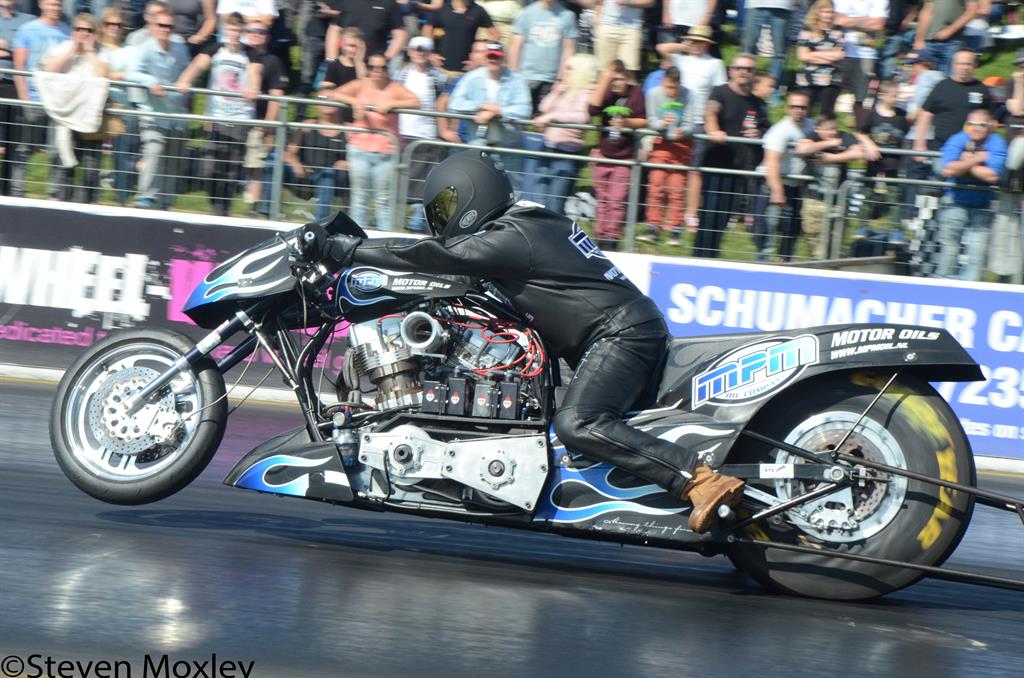 Seven-time European FIM Top Fuel Bike Champion Ian King claimed his eighth title but at the expense of two conrods breaking during the first round of the eliminations. There was a bizarre incident in the first round, were Steve Woollatt raced Fil Papafilippou. At mid-track Papafilippou crossed the centre line and hit the timing block the bike slide into the side of Woollatt’s bike which threw Papafilippou off his bike and onto Woollatt’s wheelie bars. Woollatt safely brought his bike to a stop in the shutdown area both riders were ok. Papafilippou had some minor burns to his foot. Woollatt went on to win the event when Otto Knebl in his first FIM Top Fuel bike final damaged his crankshaft and couldn’t make the call.