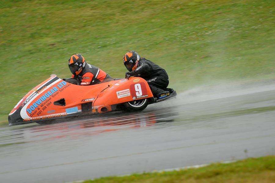The weather on Sunday was always likely to have an effect on proceedings. We were lulled into thinking it was drying up, then it was just quite light rain and then when it was time for the outfits to go to the holding bay, it began to chuck it down. No change at the start however, Founds into the left-hander and away, Ramsden was swamped by Holden and Co. But this time, the chasers were determined not to let him build a lead, Holden, Bell, Reeves, Harrison and Bryan in close pursuit. The Morgans and Dukes had pulled in while Crawford retired after going off track. Wildcards, Craig and Kirsty Hauxwell retired on lap 3 and still the leading six were in close formation. It was difficult to suggest where anyone might make a move as the spray must have restricted the drivers’ views of the track ahead.