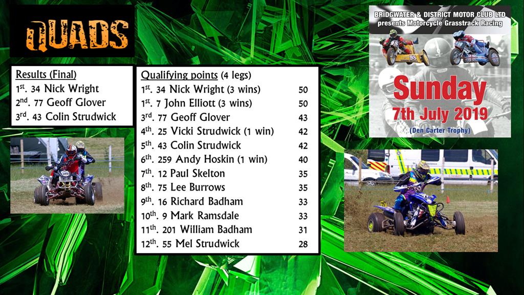 The well-supported Quad class was won by East Midlands visitor Nick Wright, who continues his fine form. He won a highly competitive final, making amends for the devastation which he suffered at this venue earlier in the year when his machine stopped whilst leading the final.